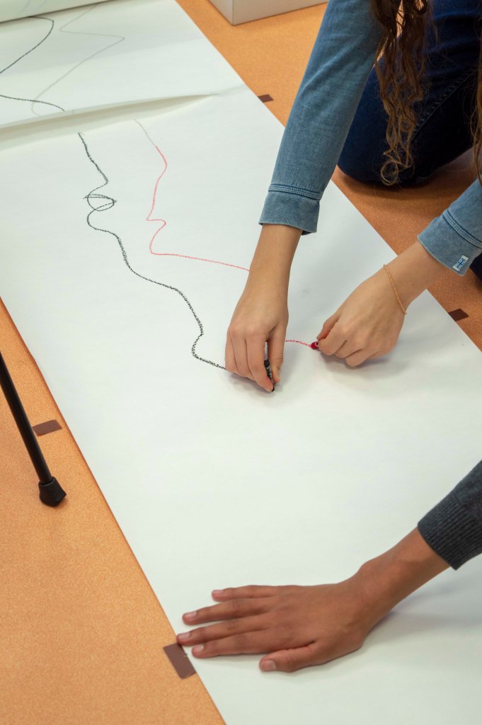 Cette œuvre collective fait partie d’une série consistant à associer les performances corporelles et sonores avec le dessin et la vidéo.