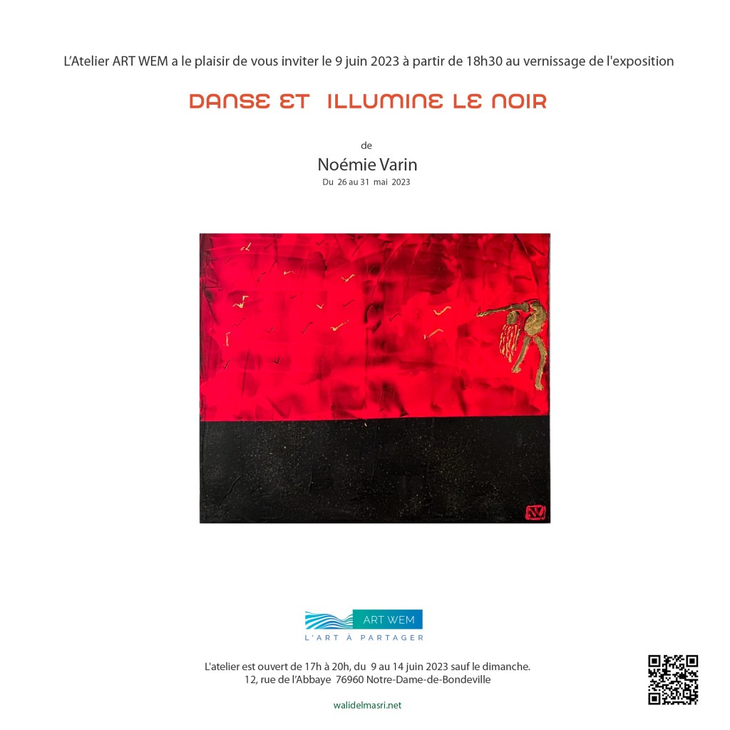 L’Atelier ART WEM a le plaisir de vous inviter le 9 juin 2023 à partir de 18h30 au vernissage de l’exposition « Danse et illumine le noir» de Noémie Varin du 9 au 14 juin 2023